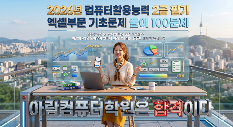 <<<< 문제 및 해설 내용을 직접 입력한 자료입니다. 맨 아래 가시면 파일 다운로드 받을수 있습니다>>>> 안녕하세요. 컴퓨터자격증다따네! 아람컴 아람돌이입니다. 아람 컴퓨터학원 컴활 2급 특강 시 엑셀 부문 첫날부터 3일째까지 드리는 문제입니다. 엑셀 부문 20문항 중 엑셀 관련 기본적 활용 문제가 못 나와도 6문제 그 이상은 나오고 있습니다. 엑셀의 기본 활용만 잘 알고 있어도 과락(8개 이하)은 면합니다. 특강 시 엑셀의 기본 활용만 300문제만 집중해서 풉니다. 컴활 처음 시작하는 깡 초보자도 쉽게 이해합니다. 직접 컴퓨터 화면 띄워서 엑셀을 직접 실습해 보여주면서 이해시키니 더 잘 하시는 것 같습니....... <img src="https://blogthumb.pstatic.net/MjAyNjA0MjRfMjU0/MDAxNzc2OTk4NTU3NTU1.PGXRYUeDxg5hNFWanmZzCm987El-BRoxby1CJiSpxn0g.WrMIz0YA7FcYFdYtwmoUsstxD62k11lbgOOwQJkjfrMg.PNG/Gemini_Generated_Image_qk1wylqk1wylqk1w.png?type=s3" />