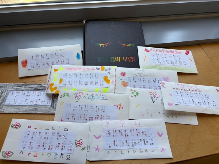 선비도서관에서 『눈을 감아보렴』 그림책과 함께 아이들과 특별한 시간을 보냈습니다. 눈을 감고 소리를 느끼고, 손끝으로 촉감을 느끼고, 점자를 하나하나 만들어가며 “보이지 않아도 느낄 수 있다”는 것을 몸으로 경험해보는 시간이었습니다. 처음에는 점자 만들기가 어렵고 낯설어 힘들어하는 모습도 있었지만, 끝까지 포기하지 않고 완성해내는 모습 속에서 아이들의 끈기와 인내를 볼 수 있었습니다. 완성 후에는 “내가 해냈다!”는 성취감과 함께 서로를 향한 따뜻한 칭찬이 오가는 시간 오늘 아이들은 감각을 통해 타인을 이해하고, 마음으로 세상을 바라보는 법을 배웠습니다. “보이지 않아도 느껴요” 아이들의 손끝에 담긴 작....... <img src="https://blogthumb.pstatic.net/MjAyNjA0MThfMTU5/MDAxNzc2NDg5MTgyMTc0.cKRIf7rlH2WncLap0kAk0ZMqqDUqni4lRI-Mlo1_RNog.u0Vnyz3UmAexu3mbdo_SC2L59OnFdylEEz2qVEbPZVgg.JPEG/IMG%A3%DF5575.JPG?type=s3" />
