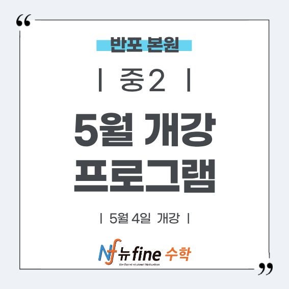 안녕하세요, 뉴파인 반포 초중등관입니다. 4월 한 달간의 치열했던 내신 대비가 마무리되고, 이제 다시 긴 호흡으로 수학 실력을 쌓아올릴 5월이 다가오고 있습니다. 뉴파인 반포 본원에서는 3월에 뜨겁게 타올랐던 학습의 열기를 이어받아, 오는 5월 4일부터 봄학기 과정을 힘차게 재개합니다. 개강 : 5월 4일(월) ~ 5월6일(수) 입반 테스트 예약 : 02)595-0304 많은 학부모님께서 이 시기에 "이미 진도가 나간 반에 지금 합류해도 괜찮을까?" 라는 고민을 가장 먼저 하십니다. 그러나 뉴파인 반포 초중등관을 오신다면, 중간 합류에 대한 걱정은 내려놓으셔도 좋습니다. 뉴파인 반포 초중등관은 아이의 아쉬운 부분을 메우고 가장 비....... <img src="https://blogthumb.pstatic.net/MjAyNjA0MjdfOTQg/MDAxNzc3MjE2OTQ1OTc2.2vBRri5cJKKNbeZG4EWkJn4e9wgZhTIi_c56_5a3mdYg.Gq0aMf-_Gxpp2mgSJ46iA0KM3J2l0RVTt_QyDpFwsqwg.JPEG/%C1%A4%B1%D4_%C7%D1%B1%DB_%C7%C1%B7%CE%B1%D7%B7%A5_%BD%E6%B3%D7%C0%CF.jpg?type=s3" />