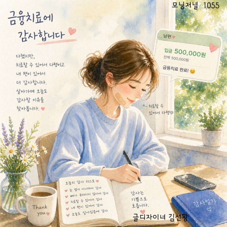 # # # #오늘의글감 #글디자이너_김선황 남편, 고마워~ * 2026년 4월 25일 토요일 모닝저널 1055 오늘 거울에 비친 턱을 보니 웃음이 납니다. 상처의 세 배는 넘어보이는 밴드가 먼저 눈에 들어왔거든요. 거울 앞에 서니 절로 다쳤던 날이 떠오릅니다. 그날 제 감정은 수시로 바뀌었습니다. 오전 11시까지만 해도 다쳤지만 부러지지 않아서 괜찮다고 안도하던 마음이, 흉터 연고나 받으려고 갔던 피부과에서 보이는 부분은 작지만 근육까지 찢어져 성형외과 가서 꿰매라고 해서 무너졌다가, 전화한 성형외과에서 지정해 주는 시간이 학생들 시험대비 시간이라 망설이다가 그래도 24시간 내에 꿰맬 수 있어 다행이다 했던 마음이 당장 수영할 수 없....... <img src="https://blogthumb.pstatic.net/MjAyNjA0MjVfNTIg/MDAxNzc3MDgxNDU0NTM3.GDIQ6mC7H5itnPvRWKXsZlhHPTxY3dTkjxZrKE76Fn4g.Y7lqQiq8CVaZV2oX2gV4NJNKrplUUUoRShw2hlrJ51kg.JPEG/900_20260425104401.jpg?type=s3" />