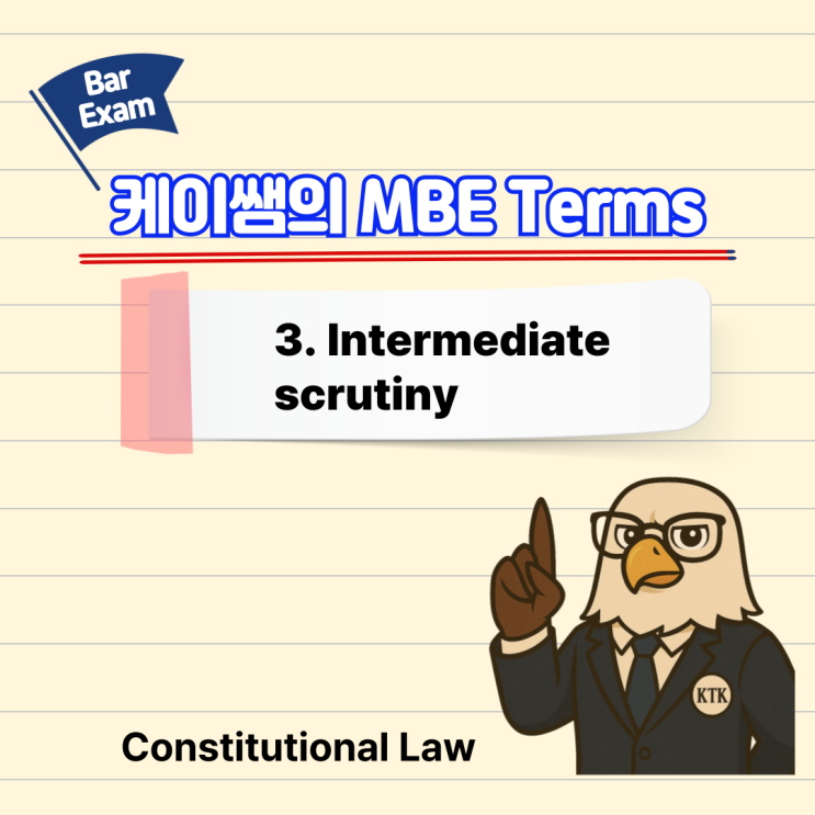 여러분, 안녕하세요? 오늘도 플래쉬카드와 함께 즐거운 하루 되세요 Constitutional Law 오늘의 플래쉬 카드는 Intermediate scrutiny 입니다. 오늘도 플래쉬 카드가 도움이 되셨다면, 하트 눌러주세요 #미국변호사시험 #김기태 #미국로스쿨 #JD #LLM #로스쿨 #LSAT #온라인LLM #미국법 #KTK아카데미 #DCBar #CABar #ILBar #NYBar #취업 #스펙쌓기 #이직 <img src="https://blogthumb.pstatic.net/MjAyNjA0MjNfNzEg/MDAxNzc2OTIzMzU5MDg0.KhNMb7DE0AJWQBxaqUGCf_sbgUJrAyt4uknDg2QFofsg.IQyQuKRz_PigmufZvdotPAhUDRaGZxVVgWBHGSWOXzEg.PNG/001.png?type=s3" />