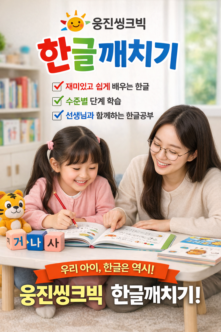 아이의 첫 공부, 바로 한글입니다. 하지만 무작정 읽고 쓰게 하기보다는 재미와 자신감을 함께 키워주는 것이 가장 중요 그래서 요즘 많은 부모님들이 선택하는 프로그램이 바로 **웅진씽크빅 ‘한글깨치기’**입니다. 수준별 단계별 한글 진도 진입 가능!!! 이런 아이에게 추천해요 한글을 처음 시작하는 5~7세 아이 글자에 흥미가 부족한 아이 혼자 공부하면 집중이 어려운 아이 체계적인 한글 기초를 잡고 싶은 경우 부모님들이 만족하는 이유 ✔ 아이가 재밌어해서 스스로 하려고 해요 ✔ 억지로 시키지 않아도 자연스럽게 읽어요 ✔ 선생님 관리로 부모 부담이 줄어요 한글, 시작이 정말 중요합니다 처음 한글을 어떻게....... <img src="https://blogthumb.pstatic.net/MjAyNjA0MTZfMTA0/MDAxNzc2MzMwMjEzMTI3.Fp-21ONSD1F9hayyDqW_ryHUeiW1ml-M5B-mM8hCWrwg.3ZS4yklwgacgjFyM7rQVjkj43se_bMCNEKLjqPxeAmYg.PNG/KakaoTalk_20260416_175625241.png?type=s3" />