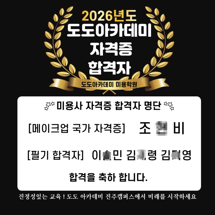 안녕하세요~ 진주 도도아카데미 미용학원입니다~ 오늘은 역시나 늘 떨리고 두근거리는 목요일 합격자 발표가 있는 날이에요~~~ 이번에 열심히 공부해서 필기합격자들도 있고요~! 이제 실기 준비 열심히 ~!!! 그리고 너무너무 열심히 실기 준비했던 우리 예쁜 학생 앞에 합격했던 학생 기운을 받아 본인도 열심히 하겠다며 시험기간 동안 늦게까지 남아서 혼자 연습하면서도 어제까지 떨려 하던 모습이 아직까지도 너무너무 귀엽게 기억나네요 우리 학생들 합격을 진심으로 축하드리며 글을 마무리하겠습니다. 그리고 수강하고 있는 지금 시험을 준비하고 있는 우리 모든 도도인들의 국시 준비를 항상 응원합니다! 더 자세한 사항들은 도도아카데....... <img src="https://blogthumb.pstatic.net/MjAyNjA0MTZfNDkg/MDAxNzc2MzA0ODczMDg5.nhWo2rE_nBozrpHh80pxUPo6KTSr5_QApwtAUdZGM1Ig.27ohttWVr35nj2ztT1-RfhcBoabj0Wc-n6WfRE-5mlkg.PNG/%C1%A6%B8%F1%C0%BB_%C0%D4%B7%C2%C7%D8%C1%D6%BC%BC%BF%E4..png?type=s3" />