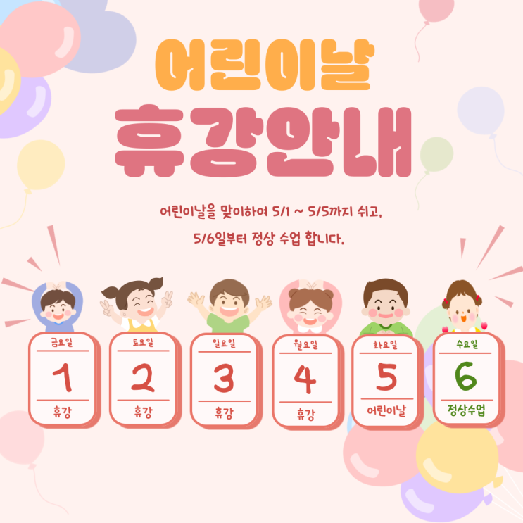 어린이날 연휴를 맞아 5월 1일(금)부터 5월 5일(화)까지 휴강하며, 5월 6일(수)부터 정상 수업이 진행됩니다. <img src="https://blogthumb.pstatic.net/MjAyNjA0MjNfMjc1/MDAxNzc2OTExOTM0MjQx.IcBN6RxNgOqKt8KAmegkSZhApYqEf9vSbjOaT_2V494g.blvn9zV94D9iXawXcD3hZ100R3Hn2Hou4G7jaWIjNNIg.PNG/%C1%A6%B8%F1%C0%BB-%C0%D4%B7%C2%C7%D8%C1%D6%BC%BC%BF%E4_-001.png?type=s3" />