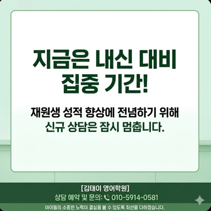 [김태이 영어학원 공지] 현재 본원은 중·고등부 내신 시험 대비 집중 기간입니다! 재원생들의 학습 지도와 성적 향상에 모든 역량을 집중하고 있습니다. 학부모님들의 깊은 양해 부탁드립니다. 현재 본원은 중·고등부 내신 시험 대비 집중기로, 신규 상담은 5월 6일(수)까지 진행하지 않습니다. 시험 종료 후 원활한 상담을 위해 사전 예약만 접수합니다. 상담을 희망하시는 학부모님께서는 아래 번호로 **[학생 이름 / 학교 / 학년]**을 문자로 남겨주세요. [김태이 영어학원] 상담 예약 및 문의: 010-5914-0581 아이들의 소중한 노력이 결실을 볼 수 있도록 최선을 다하겠습니다. 김해교육지원청 등록 제3752호 김태이영어학원 / 교습자의....... <img src="https://blogthumb.pstatic.net/MjAyNjA0MTdfMTky/MDAxNzc2NDI0OTI0MDk4.b4XAJvldT2zOMmcL0QxEKXrURY3CxLRi6hLA9iQojF0g.bVpuZ4CHukDRlxxBaZzL3flDs2SxKraGy2-JHP-nnIIg.JPEG/900_AISelect_20260417_201916_Google.jpg?type=s3" />