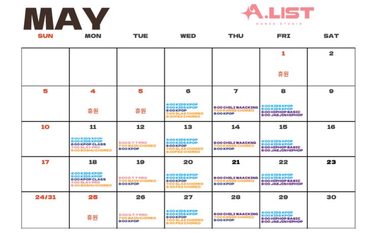 양산댄스학원 • 에이리스트댄스 5월 시간표!!! (가격변동)