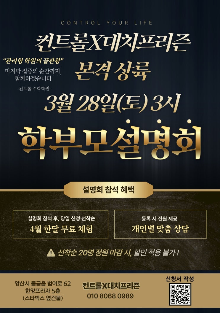 안녕하세요~ 양산 컨트롤 수학 학원 컨트롤 프리즌 관리형 학원 컨트롤 수학 프리즌 관리형 학원 원장 소현쌤 입니다 ^^ ✅ 3월 28일 (토) ✅ 오후 3시 ✅ 한양 프라자 5층 컨트롤 수학 x 프리즌 관리형 학원 에서 프리즌 관리형 학원에 대한 학부모 설명회를 진행했습니다. 네이버폼으로 사전신청을 받은 결과... 정말 많은 분들이 학부모 설명회 참여 신청을 해주셨는데요, 결국 한정된 좌석으로 인해 빠르게 마감되었었습니다. 저희 설명회에 참석해주신 모든 분들께 당일 신청에 한해 [4월 한달 수강 무료] 이벤트를 진행했습니다. 설명회 자리에서만 10명 넘게 신청해주시고, 아이와 얘기해보고 문자로 신청해주신 분들도 10명이 넘어....... <img src="https://blogthumb.pstatic.net/MjAyNjA0MDdfMjk3/MDAxNzc1NTYwNDY2NzA0.p32oy8ElvUQxzA0lfh7OarNz8GYo_GrsjKbVIteGFiUg.uKgZYBt6xc5fiQ0rtzG1U-s-jJWw3-S2k8m5dxHNZ2Ag.JPEG/%C1%A6%B8%F1%C0%BB_%C0%D4%B7%C2%C7%D8%C1%D6%BC%BC%BF%E4.-5.jpg?type=s3" />