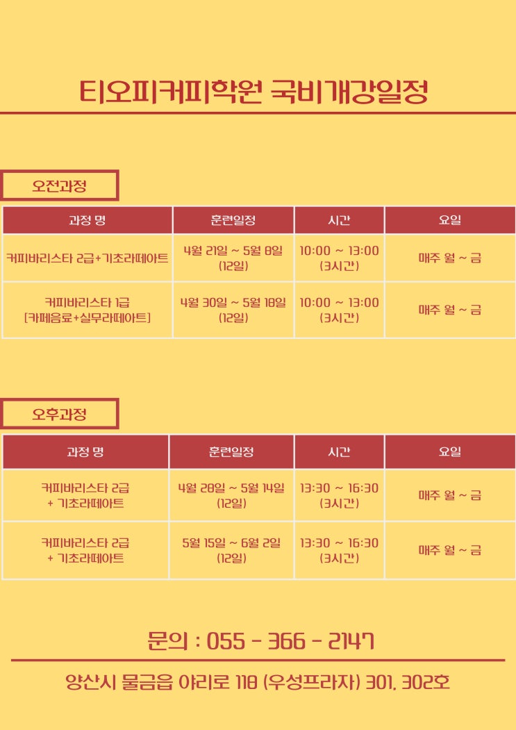 4월 바리스타 자격증 국비과정 개강 일정 안내[양산바리스타학원, 양산커피학원]
