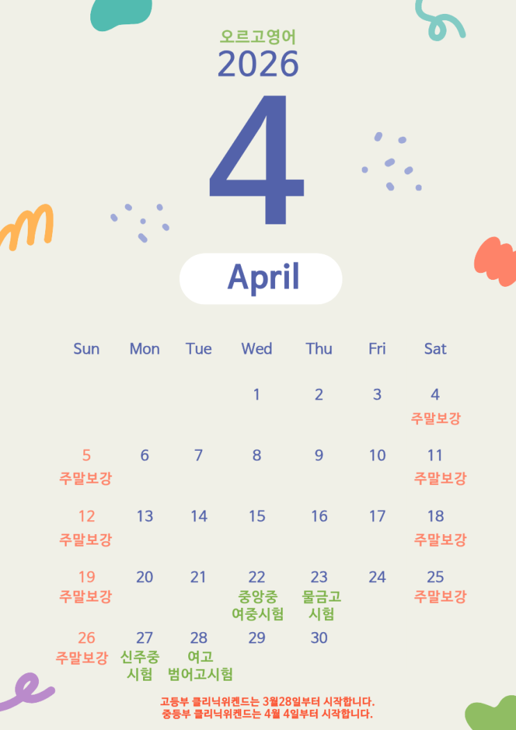 양산 범어 영어공부방 오르고영어 4월 수업 일정입니다.