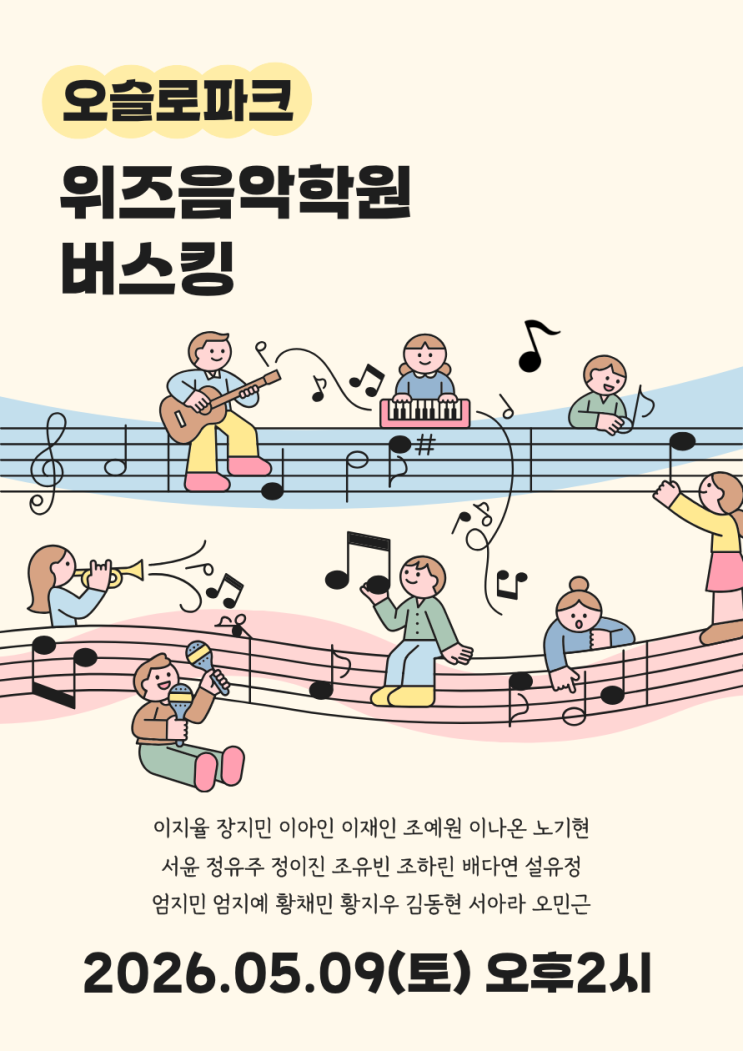 위즈음악학원에서는 우리 아이들의 무대 경험과, 자신감을 위해 다양한 연주회를 참여하고 있습니다. 이번엔 오슬로파크에서 함께 하게되었습니다! 많은 관심 부탁드립니다^^ 위즈친구들 화이팅 ! <img src="https://blogthumb.pstatic.net/MjAyNjA0MTdfNyAg/MDAxNzc2NDEyODUyMTYw.KEYqybnsMvR2cP3rJEqVtbZn1Y-6gxmthQXioGwVzPYg.jPnjw2oryKgwf_TpMEpRgeeUl7Ma3aZ9iq6BWIZ2KaYg.PNG/image.png?type=s3" />