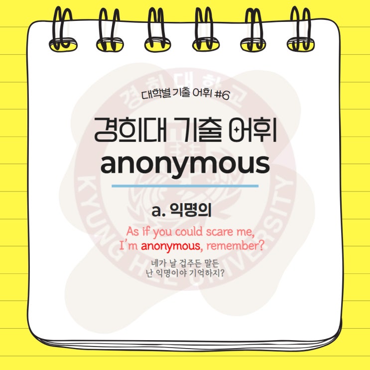 안녕하세요 강남 송파 중랑 서초 잠실 강동 별내 위례 광진 천호 구리 남양주 하남 김영편입 잠실캠퍼스 입니다. 편입영어를 준비하는 많은 학생들은 편입영어가 어떻게 쓰이는지 편입단어가 어느 정도 수준인지 궁금하실 거예요 기출단어를 암기하시는 게 어려우신가요? 걱정하지 마세요! 편입영어가 어려운 어려분들을 위해 대학별 기출어휘를 준비했어요!! 김영편입 잠실캠퍼스와 함께 편입영어를 보다 더 쉽게 외워봐요 오늘 배울 단어는 anonymous 뜻은 a. 익명의 라는 뜻이에요! 동의어로는 a. nameless, unidentified, unnamed 경희대에서 빈출했던 기출 어휘인 만큼 뜻과 그 용법까지 꼼꼼히 외워둬야겠죠? 예문으로 이 단어를 체감해볼....... <img src="https://blogthumb.pstatic.net/MjAyNjA0MjhfNjkg/MDAxNzc3MzM1NTQ1NDc5.w6vi7j3X5RGSkIqy_JY5Oaw3QxRxy26R5ixFqHI60ykg.cmbt2_iAxtB67UqPJIO1m9LTn9EymHh17Gq_LnJFbQQg.JPEG/%B4%EB%C7%D0%BA%B0_%B1%E2%C3%E2%BE%EE%C8%D66.jpg?type=s3" />