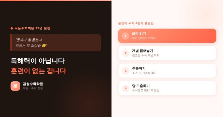 이런 말씀 하신 적 있으신가요? “우리 아이는 문제를 제대로 안 읽어요.” “문제가 뭘 묻는지 모르는 것 같아요.” “문장제 서술형만 나오면 손도 못 대요.” 많은 학부모님들이 같은 고민을 하십니다. 그러면 이런 생각도 드셨을 겁니다. 책을 많이 안 읽어서 그런 건 아닐까. 독해력이 떨어지는 건 아닐까. 그런데 막상 지금부터 책을 읽히는 것도 마땅한 답이 아닌 것 같고 — 수학 시험은 코앞인데 독서로 해결하기엔 시간이 없습니다. 독해력이 문제가 아닙니다. 훈련이 없는 겁니다. 목동수학학원에서 19년 동안 가르치면서 확인한 사실이 있습니다. 문장제 수학을 못 푸는 아이들은 머리가 나쁜 게 아닙니다. 독해력이 부족한 것도 아....... <img src="https://blogthumb.pstatic.net/MjAyNjA0MTVfMTc3/MDAxNzc2MjUyODA5ODI1.5pteGdnMnHWPtMcWokSrOIqQRF3zyTQI9VRO9woPynQg.r0rRfiKvxoUEAMVPDsql4ASbO1o54BOFrxQ4_CKQqIYg.JPEG/IMG%A3%DF0018.JPG?type=s3" />