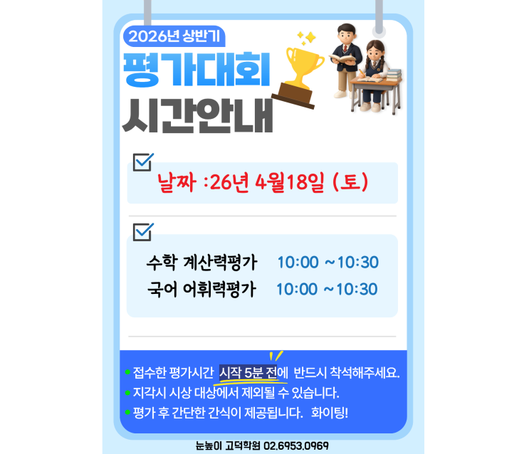 안녕하세요~~ <눈높이 고덕학원>입니다~~!!! 오늘은 우리 친구들이 그동안 갈고닦은 실력을 마음껏 발휘해 보는시간이었던 고덕학원 <계산력, 어휘력 평가대회>와 <맘스데이>를 진행 한 후기를 들려드리려고 해요~~ 한달 동안 정말 열심히 준비한 만큼 우리 친구들 얼굴에 긴장한 기색이 역력했는데요, 평소 장난기 넘치는 모습과는 달리 진지하게 임하는 모습이 정말 대견하고 자랑스러웠습니다!! 평가대회가 끝난 뒤에는 다시 장난기 많은 모습으로 돌아와 서로 먼저 선물을 받아가겠다는 우리친구들~ 이번 평가대회를 통해 우리 친구들이 '나도 도전하면 할수있다!' 라는 중요한 성공 경험을 얻어 갔으면 좋겠습....... <img src="https://blogthumb.pstatic.net/MjAyNjA0MjFfOTMg/MDAxNzc2NzMzMDkxOTgz.cdT5b1bJfq2yM1zMzCqkY0RoMV1jiSZrArQNITTgS88g.Z2kIQNZYNbS8qmMzWwSUDgGeglP1FYNMvH27oKIvK5wg.PNG/image.png?type=s3" />