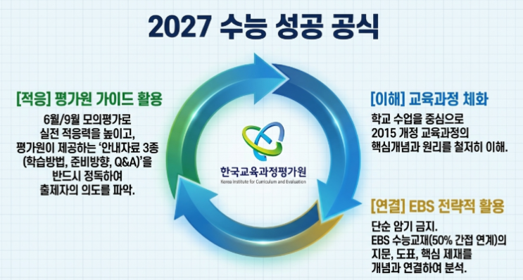 안녕하세요, 여러분의 꿈과 함께 대학으로 가는 길! 명일동에 위치한 대가수학입니다. 지난주 한국교육과정평가원에서 '2027학년도 대학수학능력시험 시행기본계획'을 발표했습니다. 오늘은 이 시행계획을 바탕으로 과목별 실전 전략을 안내할까 합니다. 1. 2027학년도 수능의 본질:"무엇을 평가하는가?" 대학수학능력시험은 단순한 지식의 양을 측정하는 '암기 테스트'가 아닙니다. 이 시험은 다음 세 가지 핵심 가치에 뿌리는 두고 있습니다. 대학교육 수학 능력 측정: 대학 전공 서적을 읽고 논리적으로 사고하며 문제를 해결할 기초 역량이 있는가? 고교 교육 정상화 기여: 학교 수업을 성실히 이수한 학생이....... <img src="https://blogthumb.pstatic.net/MjAyNjA0MTBfMTc5/MDAxNzc1ODIzMzkwNDE2.ezIWtQXcI-61DJxYHAHfNaB7-9dyQcBpXmXZ1PwEtCgg.xe9g6c3IQdzp3kzCKBNmebgJo7LapgZQn7ADMP3intkg.PNG/image.png?type=s3" />