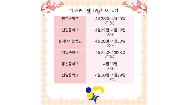 지난주에 이어 이번 주말도 투플러스학원의 강의실은 중학생들이 자리를 채웠습니다. 갑자기 날씨가 더워져서 열기가 후끈 달아올랐습니다. ^^ 오늘 오전에도 보강 수업 현장을 다녀오고 이제야 한숨 돌리며 글을 쓰네요. 중학생 아이들에게는 일 년 중 가장 예민하고 중요한 중간고사 시즌이 다가왔기 때문입니다. 우리 학원은 천호중, 천일중, 강일중, 성덕여중, 동신중, 신암중학생들이 다니고 있습니다. 주말 보강이란... 모두가 쉬고 싶은 주말이지만, 부족한 부분을 채우기 위해 보강 수업에 참여한 아이들이 기특하기만 합니다. [중3 A군] T : "역시, 제일 일찍 마치고 가는군!" S : "네, 안녕히계세요." T : "응....... <img src="https://blogthumb.pstatic.net/MjAyNjA0MThfMjU4/MDAxNzc2NDk3Njg2OTk3.WJy4K4x0SiIU_cUqirGUbD8pAoV80uwIIJE--tM6d1sg.5q_oHdYZGmNbXUhCTXPmLLXT9WqwOcFPqsKhhlTB04kg.JPEG/1%C7%D0%B1%E2_%C1%DF%B0%A3%B0%ED%BB%E7%C0%CF%C1%A4.jpg?type=s3" />