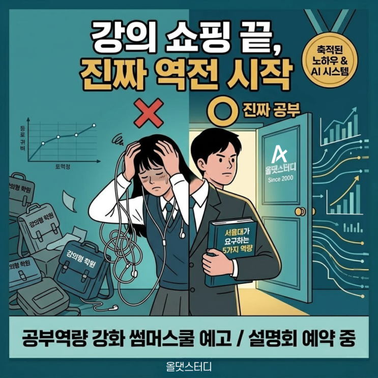 2026썸머스쿨 설명회 참석 예약 안녕하세요, 명일동 학부모님들. 올댓스터디 학원장 최명호입니다. 대입 정시 모집이 끝나고 합격증을 받아 든 아이들의 감사 문자를 보며 보람을 느끼는 것도 잠시 , 저는 다시금 우리 아이들이 살아갈 미래를 걱정하게 됩니다. 4차 산업혁명의 소용돌이 속에서도 아이들은 여전히 블랙홀 같은 입시 전쟁터에 서 있습니다. "우리 아이는 성실한데 왜 성적이 안 오를까요?" 지난 27년(2000년~2026년) 동안 공부캠프를 운영하며 제가 가장 많이 들은 질문입니다. 오늘 그 불편한 진실을 말씀드리려 합니다. 1. 아이들은 지금 '강의 쇼핑'을 하고 있습니다 유명 강사의 현란한 수업을 듣고 있으....... <img src="https://blogthumb.pstatic.net/MjAyNjA0MjBfMjc3/MDAxNzc2NjU4NDg4MTYx.SbYFYHr1sJxGQcWt89SgFrR5cEVqnkD86x41PFQ32DEg.iPMMttcp_-yCbAqYF6JlT1egAN12VSbYMyr5TvIxhvQg.PNG/1.png?type=s3" />