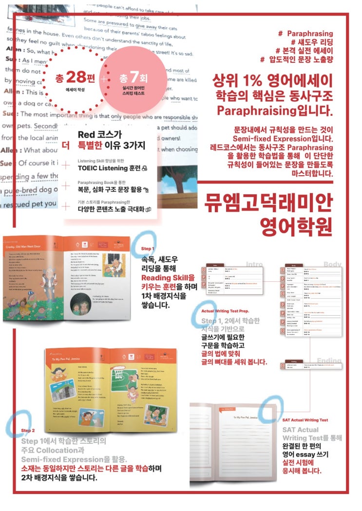 오늘은 고학년 과정인 레드와 블랙 중에서 레드 단계에 대해 소개해드리고자 합니다. 뮤엠은 화이트 옐로우 그린 블루 그리고 오늘 소개할 래드와 블랙 코스로 이어집니다. 저희 뮤엠고덕래미안에서는 그 사이에 단어를 강화하고 영어어순 훈련을 병행해가며 언어학습의 핵심에 접근합니다. 직전 블루 단계가 작가의 의도를 파악한, 리라이팅에 중점을 둔 과정이라면, 레드 단계는 paraphrasing(어휘,의미 확장 글 다시쓰기)을 통해 좀 더 수준 높은 에세이를 쓰게 되는 고급 에세이 과정이라고 보시면 될 것 같습니다. paraphrasing은 간단히 정의하면, 같은 글이라도 다른 방식으로 표현하는 것을 일컫습니다. 아이들이 기존에 첨삭받은 글과 유....... <img src="https://blogthumb.pstatic.net/MjAyNjA0MDdfMjYw/MDAxNzc1NTQ1MTgxMTIx.sTAW9pPWgkXUznafem7ClXxD1fl939GTjgdLcrDE2qwg.p9PgoYZH9ahmQVxSAASF6CFgkO07byVMBprzSEoUAb4g.JPEG/%C6%E4%C0%CC%C1%F6_%BF%F8%BA%BB_%28%C1%A4%B9%AE%BE%D5_%BA%F1%C4%A1%BF%EB_%C0%FC%B4%DC%29_%B9%C2%BF%A5%BF%B5%BE%EE%BF%A1%BC%AD_%BD%C3%C0%DB%C7%CF%BC%BC%BF%E4_1.jpeg?type=s3" />