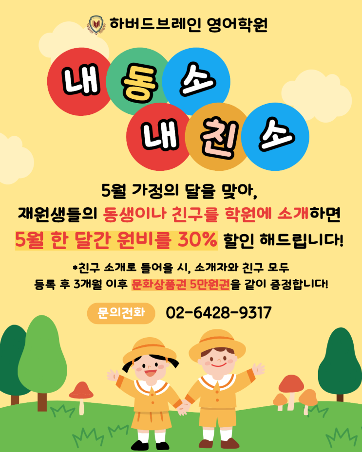 안녕하세요. 고덕동 초중등전문 영어학원 하버드브레인 에리카 원장입니다. 5월 가족의 달을 맞이하여 하버드브레인 이벤트를 준비하였습니다. '내동소 내친소', 말 그대로 내 동생 소개, 내 친구 소개입니다. 학부모님들과 이야기를 나누어보니 학원은 결국 "누가 추천하느냐"가 가장 큰 기준이 되더라고요. 그래서 실제로 다니는 친구의 소개로 좋은 인연이 이어졌으면 하는 마음으로 이번 이벤트를 기획했습니다. 내동소 내친소 혜택 안내 -5월 한 달간 소개로 등록 시 원비 30% 할인 -친구 소개 등록 시, 소개한 학생과 친구 모두 해당 -3개월 이상 유지 시, 각각 문화상품권 5만원권 증정 단순히 가격 측면의 이벤트가....... <img src="https://blogthumb.pstatic.net/MjAyNjA0MjBfMTgw/MDAxNzc2Njc0ODUwNDM4._QfLlpVNtcfz2QgHd_eVG6zHQIPuJOCwPXGkV-RMMJog.ECKRlHrZPi0HlS6iPRZedXrIJfVxVbAj_HPQkWoffvsg.PNG/image.png?type=s3" />