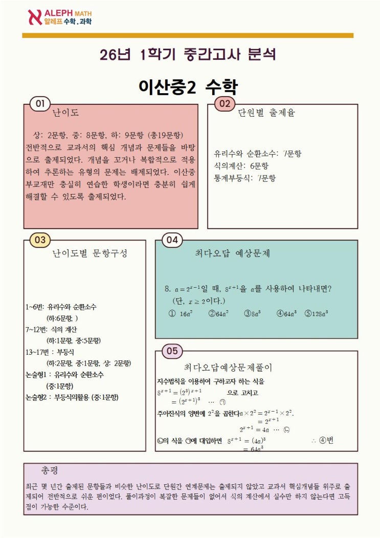 안녕하세요! 이산중 수학학원 동탄역 알레프 수학과학학원입니다. 최근 마무리된 이산중학교 2학년 1학기 수학 중간고사, 학생들의 결과는 어떠했나요? 2학년이 되어 치른 첫 시험이라 당황한 학생들도 있었을 텐데요. 시험은 끝이 아니라 '나의 약점을 파악하는 이정표'입니다. 오늘은 이산중 전문 알레프 수학에서 분석한 2026 이산중 2-1 수학 중간고사 리포트를 통해 기말고사 역전 전략을 공개합니다! 1. 이산고 수학 중간고사 총평 및 출제 경향 이번 이산중 2학년 수학 시험은 전반적으로 '기본에 충실하면서도 변별력을 갖춘' 형태로 출제되었습니다. 난이도 구성 하(30%) / 중(50%) / 상(20%) 수준으로 배....... <img src="https://blogthumb.pstatic.net/MjAyNjA0MjZfMTc2/MDAxNzc3MTc2NjUxNTEw.3mJr1n26_LDgDCeHmBREG4BiZ0UJZCN5JGomcGppGPkg.m2PxnSdZObs7mW43b4szFNqcXm9l7SKvdthySmbsGXUg.JPEG/%C0%CC%BB%EA%C1%DF2-1%C1%DF%B0%A3%BC%F6%C7%D0%BD%C3%C7%E8%BA%D0%BC%AE%BA%B8%B0%ED%BC%AD.jpg?type=s3" />
