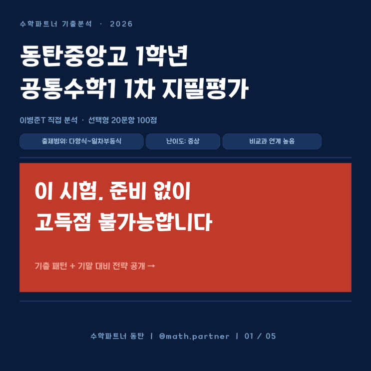 안녕하세요, 동탄 수학의 기준, 수학파트너입니다. 중간고사가 끝났습니다. 시험을 치르느라 고생한 동탄중앙고 1학년 학생들과 학부모님들, 모두 고생 많으셨습니다. 수학파트너에서는 이번 시험이 끝난 직후, 단순히 점수 확인에 그치지 않고 '왜 이런 결과가 나왔는지' 기출 패턴을 면밀히 분석했습니다. 다가올 기말고사는 이번 시험의 연장선에 있기 때문입니다. 오늘은 동탄중앙고 1학년 공통수학1 1차 지필평가 분석 결과와, 이를 바탕으로 한 기말고사 고득점 전략을 공개합니다. 1. 동탄중앙고 1학기 1차 지필평가 총평 이번 시험, 학생들의 체감 난도가 높았던 이유가 분명히 있습니다. 출제 범위: 다항식의 연산 ~ 일차부등....... <img src="https://blogthumb.pstatic.net/MjAyNjA0MjdfMzgg/MDAxNzc3Mjg1Njg0MjM0.qz_bDg8Lt4nOrdg-LNFcQH9rFEGO8VP00n-vDCFaGrQg.yxgVt7jP2gg0sjKjNnX0bU4e4piBAGSRT4xsDrpmbL4g.PNG/5-1.png?type=s3" />