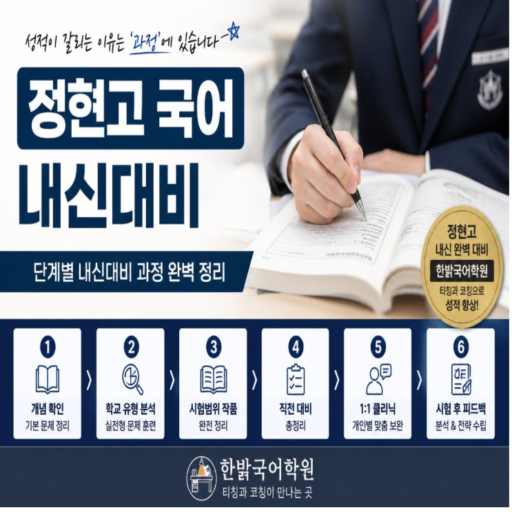 안녕하세요? 동탄 국어전문 한밝국어입니다. 중간고사·기말고사가 다가오면 많은 학생들이 이렇게 말합니다. “문제는 많이 풀었는데 점수가 안 나와요.” 하지만 정현고 국어 내신대비에서 중요한 건 문제량이 아니라 ‘준비 과정의 구조’입니다. 정현고는 단순 암기형 문제가 아니라 - 작품 이해 - 출제 패턴 분석 - 변형 문제 대응력 이 세 가지를 모두 요구하는 시험입니다. 그래서 오늘은 정현고 국어 내신대비를 어떻게 준비해야 하는지 실제 한밝국어 내신 대비 교재 흐름을 바탕으로 단계별로 구체적으로 설명드리겠습니다. 한밝국어만의 내신대비 교재로 체계적으로 준비 가능 1. 1단계 : 개념 확인문제 + 적용하기 문제 + 사고하기 문....... <img src="https://blogthumb.pstatic.net/MjAyNjA0MjZfMTE5/MDAxNzc3MTYyMjM2NTg4.IUNIRKK1sWFUSCJJOE5YQC_u2CORwnNP2OomJBFU1ukg.nqy2gf_72D7YypjVR6hmqvaxWpfESJMbt4_UOcf9bCcg.JPEG/%C1%A6%B8%F1%C0%BB_%C0%D4%B7%C2%C7%CF%BC%BC%BF%E4.jpg?type=s3" />