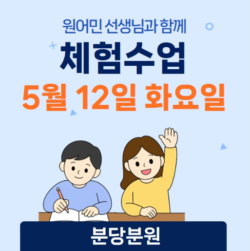 영어를 ‘배우는 것’에서 ‘사용하는 것’으로 바뀌는 경험, 단 하루 체험수업으로 우리 아이의 영어 방향을 확인해보세요! 영어, 직접 해보면 달라집니다 체험수업은 우리 아이 영어의 현재와 방향을 확인하는 가장 빠른 방법입니다. “영어를 배우고는 있는데 막상 말은 못 하는 것 같아요.” 많은 학부모님들이 공통적으로 느끼는 고민입니다. 그래서 중요한 건 얼마나 배웠는지가 아니라 얼마나 ‘사용해봤는지’입니다. 이번 체험수업은 아이들이 직접 말하고 표현해보는 경험을 통해 영어에 대한 자신감을 만들어가는 시간입니다. 대상별 맞춤 체험수업 학년에 맞춰 다른 방식으로 영어를 경험합니다. 초등 1~3학년 → 나....... <img src="https://blogthumb.pstatic.net/MjAyNjA0MjdfMTY0/MDAxNzc3Mjk1NjQzMjE1.lIXYqykKYEHf3Ypbs2JJdMf76ePvVdoZABW9k5FzwF0g.PrHtwubYlp9Dz7blTAxCmBw5RnR2lmnQgV382UiS9SYg.PNG/image.png?type=s3" />