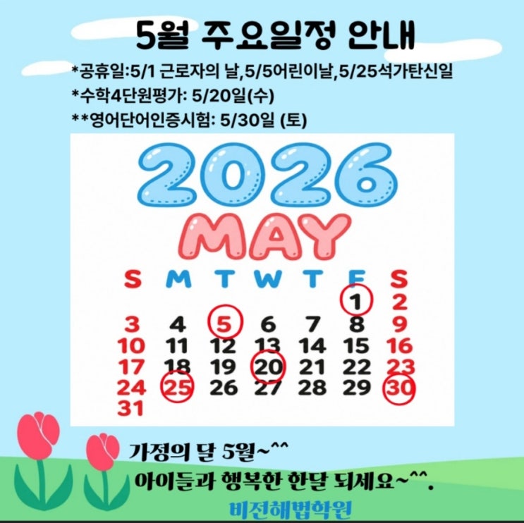 안녕하세요~^^ 5월의 아름다운 햇살이 푸르고 푸른 나뭇잎과 만나 눈이 부신 계절입니다. 금호동 아이들의 영어 수학 학습을 책임지고 있는 비전해법학원 5월 일정 공유드립니다. 5월에는 3번의 공휴일이 있습니다. 가정의 달답게 가족과 함께 보내며 쉼과 충전을 누리는 멋진 시간 보내세요!! 또한 학기의 중반! 학업 성취감을 높이는 시간으로 스마트러닝 영어 단어 인증평가에 도전합니다. 작년에도 훌륭한 성취를 얻었던 것처럼 올해도 좋은 결과를 얻도록 최선을 다해 보아요^^ 5월은 날씨가 좋은 만큼 아이들의 집중력이 흐트러지기 쉬운 시기입니다. 학원에서도 학습의 흐름이 끊기지 않도록 꼼꼼히 관리하겠습니다. 가정에서도 관심과 격....... <img src="https://blogthumb.pstatic.net/MjAyNjA0MjhfODAg/MDAxNzc3MzU3OTYyNDk1.hhzddL-w3RUpURy2LOQXBGcwXHspdgMs-ZiwQxP7CNAg.kVnhc3dJfYYZDdelTSnlL2XZXsFfF4JhAvQ89MGnob8g.JPEG/900_Screenshot_20260428_151954_KakaoTalk.jpg?type=s3" />