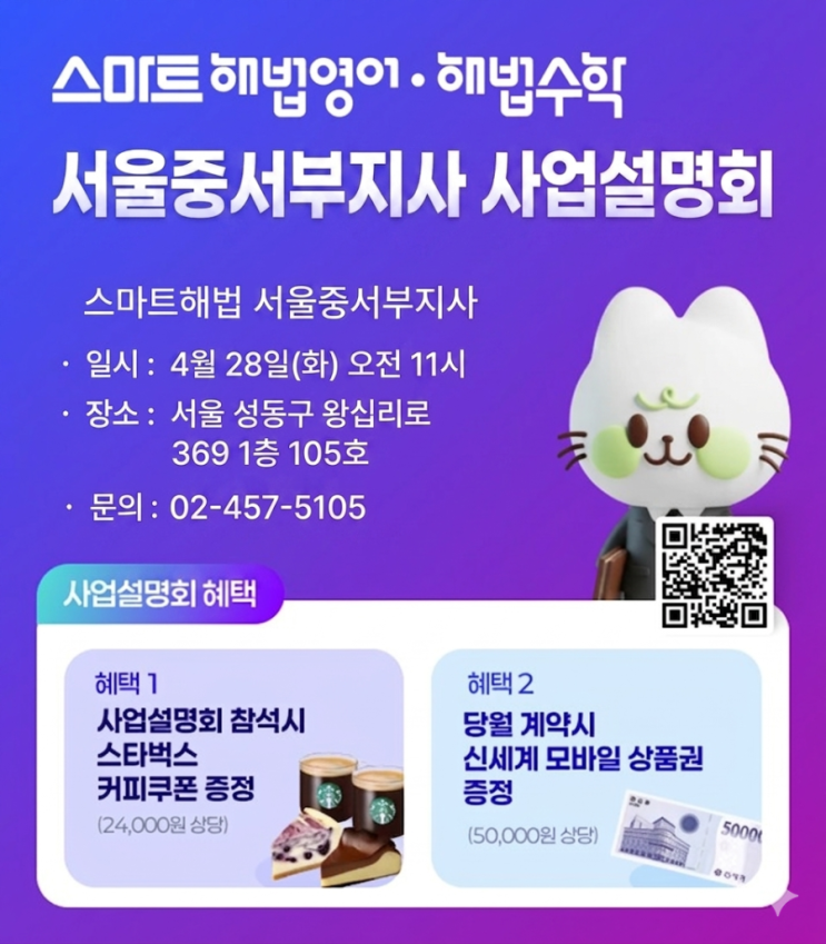 안녕하세요! 교육 전문가와 마케팅 전문가가 함께하며 원장님들의 든든한 파트너가 되어드리는 스마트해법 서울중서부지사입니다. 지난 1분기, 저희 지사 산하 4개 가맹점이 전국 1,900여 개 지점 중 전국 TOP 10에 진입하는 놀라운 성과를 거두었습니다. 이러한 성공 노하우를 바탕으로, 은평구와 서대문구까지 지역을 확장하여 새롭게 출범한 저희 지사에서 원장님들을 모시고 사업설명회를 개최합니다. 치열한 교육 시장에서 '멘탈 진단'과 '1:1 맞춤형 학습 시스템'으로 확실한 경쟁력을 갖추고 싶으신 예비 원장님 및 브랜드 전환을 고민하시는 원장님들의 많은 참여 바랍니다. 사업설명회 상세 안내 일시: 2026년....... <img src="https://blogthumb.pstatic.net/MjAyNjA0MjNfMjEx/MDAxNzc2OTI4OTk4NTM3.zPcDXumd5jhKRcTuljJyfiOEVUUm2Flo1nk4Y9i-aVsg.oKwC1bbGq7jpQ8uiBoqroN78jQF0QJhKNmgDV8VY9ZYg.PNG/900_1776928814227.png?type=s3" />