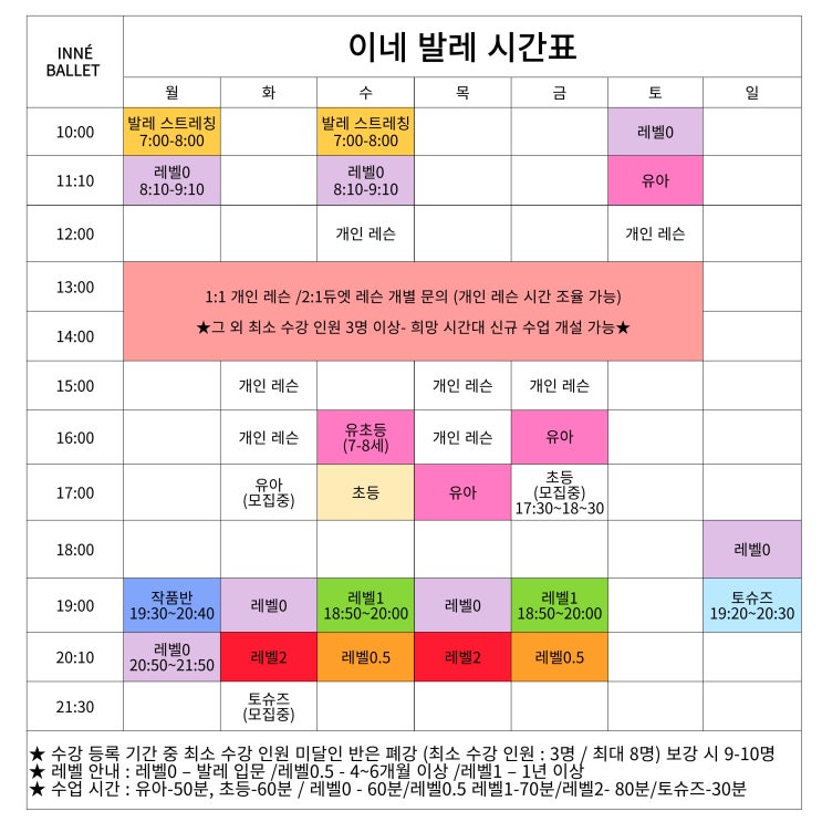 안녕하세요 성동구 텐즈힐몰에 위치한 #텐즈힐발레 #이네발레학원 5월 시간표 및 개강일 그리고 종강일 안내드립니다 시간표 외 최소 수강인원 3명 이상 시 희망하는 시간대 신규 수업 개설 가능합니다. (문의 환영) (정원8명/보강9-10명) 5월 일정 안내드립니다 (학원 문앞에도 게시되어 있습니다) -기존 회원 등록기간은 매월 4주차 입니다. (결제 순 마감) -신규는 상시 등록 가능합니다. (발레 입문이신 분들은 월초 등록을 추천드립니다) -수업은 매달 새로운 프로그램으로 진행됩니다. 이네발레는 한달 4주차 수업으로 매달 나오는 개강,종강일, 휴원일을 참고 부탁드립니다 이번달 5주차 휴원일은 5/1(금), 5/2(토) 입니다 ▶5/5(화) 어린....... <img src="https://blogthumb.pstatic.net/MjAyNjA0MjNfMjU5/MDAxNzc2OTI4ODk1NDk1.f4S57mqurshQFxgYtv6t2yl4a9ghBOlyNuDfiNLiVusg.u-kdBpyV3gL59p-INIOX71pQrrmyGkIgw5r9elK9BSkg.JPEG/2026%B3%E25%BF%F9_%BD%C3%B0%A3%C7%A5.jpg?type=s3" />