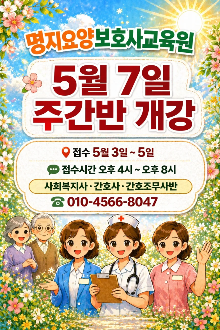 명지요양보호사교육원 자격증 반 개강합니다~ 간호사 간호조무사 사회복지사반 미리 자격증 준비해 보세요~ 주간반. 5월7일목 9시30분 시작합니다. 종일반이예요. 오후 6시에 마칩니다. 실습까지 8일반. 수강신청기간. 5월3일일~ 5월5일화 수강신청시간. 오후4시 ~오후8시. ※ 위 안내는 혹시 수정될 수 있습니다. 주간 야간반 수정되는 경우 양해를 구합니다. 야간반 5월15일금 개강. 수업시간. 매주금 오후6시~밤10시. 매주토 오후2시~밤10시. 수강신청기간. 5월12일화~5월14일목 수업신청시간. 오후4시~오후8시 제출서류. 신분증복사1. 등본1 / 신청자 정보만 다 나타나도록. 자격증사본1. 원본제시. 사진1. ~출석은 휴대폰 비콘으로 합니다. ....... <img src="https://blogthumb.pstatic.net/MjAyNjA0MjhfNiAg/MDAxNzc3MzY4MzY2NjM4.gCEryI6YiXiMpo8Vj2oMEE-eyqs7Ejz5CTjFbRilgcsg.QAdMlhmuIiivZEKeowqbJyUlrc4blZ3iukQrVmym2H0g.JPEG/900_20260427_135411.jpg?type=s3" />
