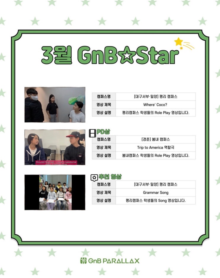 GnB☆Star로 선정된 여러분! 축하드립니다! 평리지앤비영어학원에서는 매달 배우고 익한 내용을 바탕으로 친구들과 함께 영어실력을 뽐내기 위한 영상을 찍고 있어요! 지앤비패럴랙스학원 평리캠퍼스 521-7905 초등영어/중등영어/고등입문 초등수학/중등수학 #지앤비영어, #초등영어학원, #중등영어준비, #초등수학학원, #중등수학준비, #기초부터탄탄히, #체계적인학습관리, #평리동지앤비영어, #학습진단, #과자뷔페, #학습로드맵, #파닉스무료체험, #겨울방학학습, #방학을기회로, #선행학습, #학습습관형성, #평리동영어학원, #예비중1학부모, #중학교대비, #서구영어학원, #대구서구학원, #지앤비패럴랙스, #평리캠퍼스 <img src="https://blogthumb.pstatic.net/MjAyNjA0MDdfMTIw/MDAxNzc1NTMzMTA0MzY3.1Ak_ahOc0zWQZ7hThW-VtXLvNFpU4sQ9SFBH31-Xytgg.jnAW0NIQZqK8rH4VqH1_VpEKuX-f3YQwzKrEABuR-Dwg.JPEG/KakaoTalk_20260407_123510219_01.jpg?type=s3" />