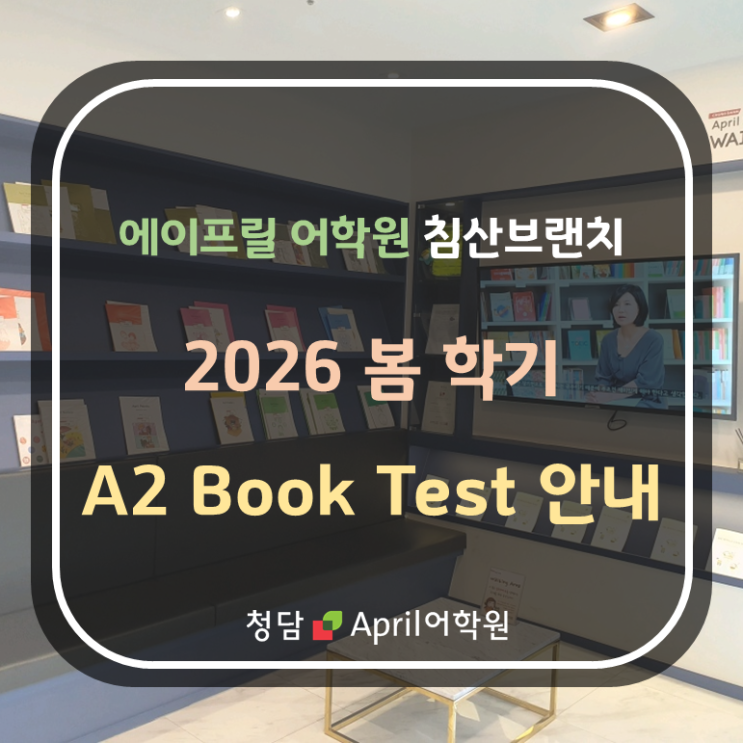 안녕하세요 침산동 대표 영어학원 청담April어학원 침산브랜치 입니다. 4월 한달간의 학습을 점검하는 시험 A2 Book Test 에 대해 안내드리겠습니다. A2 Book Test 일정 월목 반 : 4월 27일 (월) 화수금 반 : 4월 28일 (화) 시험 범위 A2 Lesson 1~8 : 4월 한 달간 학습한 A2 track의 전체 내용 Book Test 의 경우 기본적으로 Listening [듣기] Reading [읽기] Speaking [말하기] Writing [쓰기] 시험으로 진행됩니다. Listening / Reading 시험의 경우 모든 레벨 공통으로 객관식 10문제씩 출제됩니다. 반드시 Gallery Book의 Lesson Story와 Practice Book의 Comprehension Check-up 문제들을 복습할 수 있도록 해주세요! Speaking/Writing 시....... <img src="https://blogthumb.pstatic.net/MjAyNjA0MTVfMjQg/MDAxNzc2MjQ4NDAyNTgy.I3X-bedxiX8hb4DQlv6kYYRtxvSA-xMOsa3SDVG3CfQg.GSSHCWkLxcpDkZ7VKXUR3_p8bTc1xYoaEemeJNqG9bYg.PNG/%BA%ED%B7%CE%B1%D7%C5%B8%C0%CC%C6%B2%28NEW%29-%BA%CF%C5%D71.png?type=s3" />