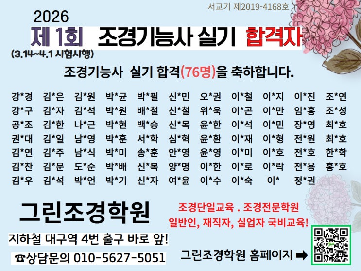 [그린조경학원] (26년 1회) 조경기능사 76명 합격! 자격증 취득 : 국비 지원(내일배움카드), 교재.제도용품 지급 /대구 조경기능사 학원