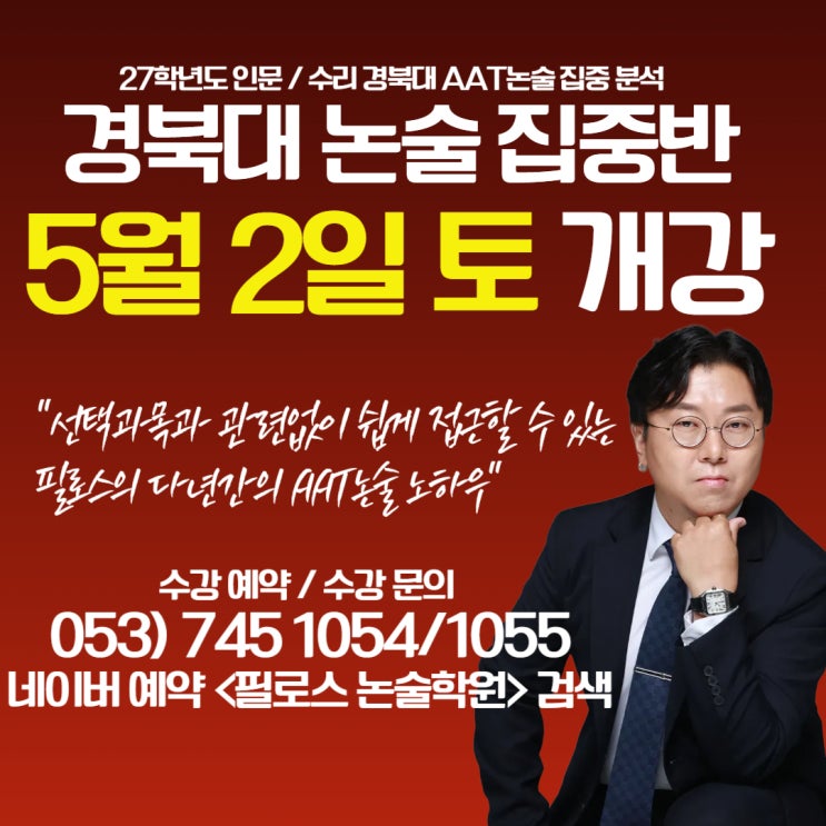 안녕하세요. #대구논술학원 필로스 논술학원입니다. 대학입시를 준비하면서 경북대학교 입학을 지망하는 학생들 중 다른 전형으로 경북대를 지원할 수 있는 방법은 없을까? 고민하는 학생들도 있을텐데요. 그런 학생들의 고민을 해결할 수 있는 #경북대논술 집중반이 개강되었습니다. 선택과목과 관련없이 쉽게 접근할 수 있는 경북대 인문/수리 집중반 개강 #AAT논술 단순히 단답식으로만 작성하는 논술이 아닙니다. #경북대논술 전문 강사의 AAT 논술 수업으로 확실하게 대비하세요. 경북대 집중반은 인문과 수리 각각 개강 하오니 많은 관심 부탁드립니다. 필로스는 오직 입결로 증명합니다. 2027학년도, 다시 한번 입결로 증명하겠습니다. 논....... <img src="https://blogthumb.pstatic.net/MjAyNjA0MTdfMTgz/MDAxNzc2NDEzMTYyOTY5.CnDh20-ByR1qMOX4QEzF5EQuVGAuz9pzlhS11W6PsoAg.58CErfCjPs47v5COC_3IPIZA4QTmZ8oderpLwQMJXF0g.JPEG/%B0%E6%BA%CF%B4%EB_%B0%A1%C3%B5%B4%EB_%C1%FD%C1%DF%B9%DD_%BA%B9%BB%E7%BA%BB-003.jpg?type=s3" />