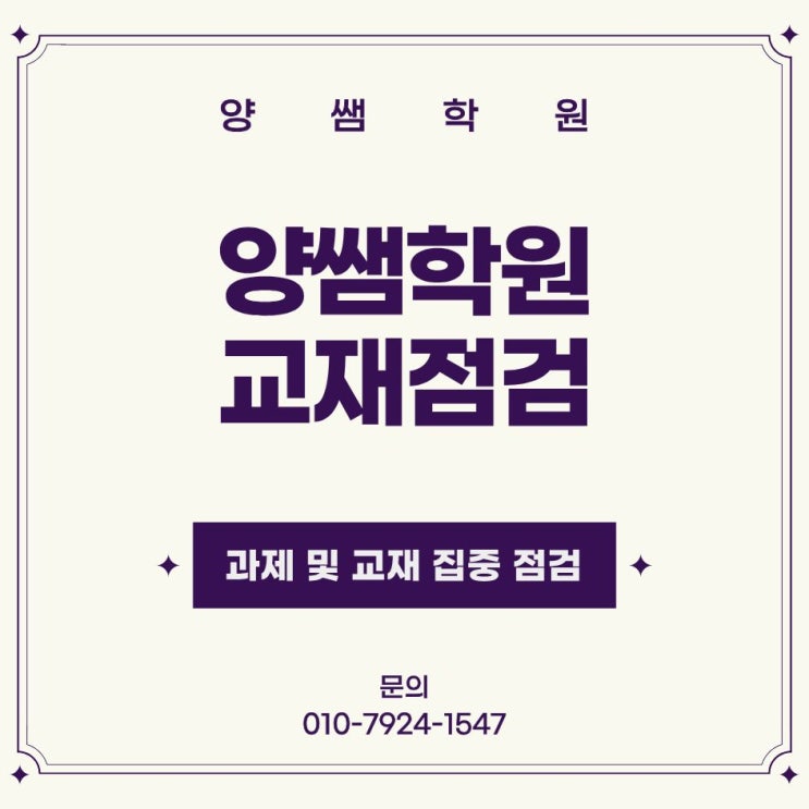 안녕하세요. 양쌤학원입니다. 양쌤학원은 학생들의 학습 흐름을 놓치지 않기 위해 교재와 과제 점검을 체계적으로 관리하고 있습니다. 단순히 확인하는 과정이 아니라, 교재를 따라가는 모든 과정 속에서 코칭과 티칭이 함께 이루어지는 점검입니다. 양쌤 교재 점검 및 관리 교재는 페이지별로 꼼꼼하게 확인되며, 학생이 어떻게 접근하고 있는지까지 함께 살펴봅니다. 또한 점검표에 도장을 활용해 당일 과제와 교재를 그날 바로 점검하고 마무리합니다. 미루지 않고, 과제와 학습을 그날 안에 완결하는 것을 원칙으로 합니다. 이러한 점검 과정은 부족한 부분을 바로 보완할 수 있게 만들고, 학습의 흐름이 끊기지 않도록 도와줍니다. 양....... <img src="https://blogthumb.pstatic.net/MjAyNjA0MDlfMTEw/MDAxNzc1NzIyMjIyOTEx.rMgy6ddWyBuKpgk-CgQKrMHSAo-0rT6VLrgiRusGcqUg.UElC6JzPmFm_KIVBQRISf0RyVSuRPp1Eoj-mkdI0DWsg.JPEG/%C1%A6%B8%F1%C0%BB_%C0%D4%B7%C2%C7%D8%C1%D6%BC%BC%BF%E4..jpg?type=s3" />