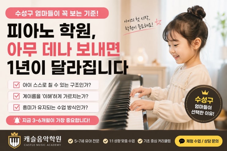 수성구 엄마들이라면 한 번쯤 이런 고민 해보셨을 거예요. “피아노는 다 비슷하게 가르치는 거 아닌가?” “집 가까운 곳 아무 데나 보내도 되지 않을까?” 그런데 실제로 보내보면 아이 결과는 학원마다 완전히 달라집니다.!! 같은 피아노인데 왜 차이가 날까요? 핵심은 “속도”가 아니라 처음 3~6개월의 기초 구조입니다.어떤 아이는 금방 흥미를 잃고 어떤 아이는 스스로 연습하는 습관이 생깁니다 이 차이는 재능이 아니라 “처음 배우는 방식”에서 결정됩니다. 수성구 엄마들이 꼭 보는 3가지 기준 학원 선택 전에 이건 꼭 체크해보세요. 1. 아이가 스스로 칠 수 있게 되는 구조인가 단순 따라치기는 금방 한계가 옵니다. 2. 계이름....... <img src="https://blogthumb.pstatic.net/MjAyNjA0MjFfMSAg/MDAxNzc2NzY2MzcxOTE5.Wm0ME6Uenf47_yIKGwiGmw1Ih1-0gsO7NxogXREO6UIg.SQGhTD9NwnBqrpU2CREjX2pNVP9Fp31dpoogwP7vJ14g.JPEG/51428F94%A3%AD9ECF%A3%AD442D%A3%AD879B%A3%AD35DB141B72D3.jpg?type=s3" />