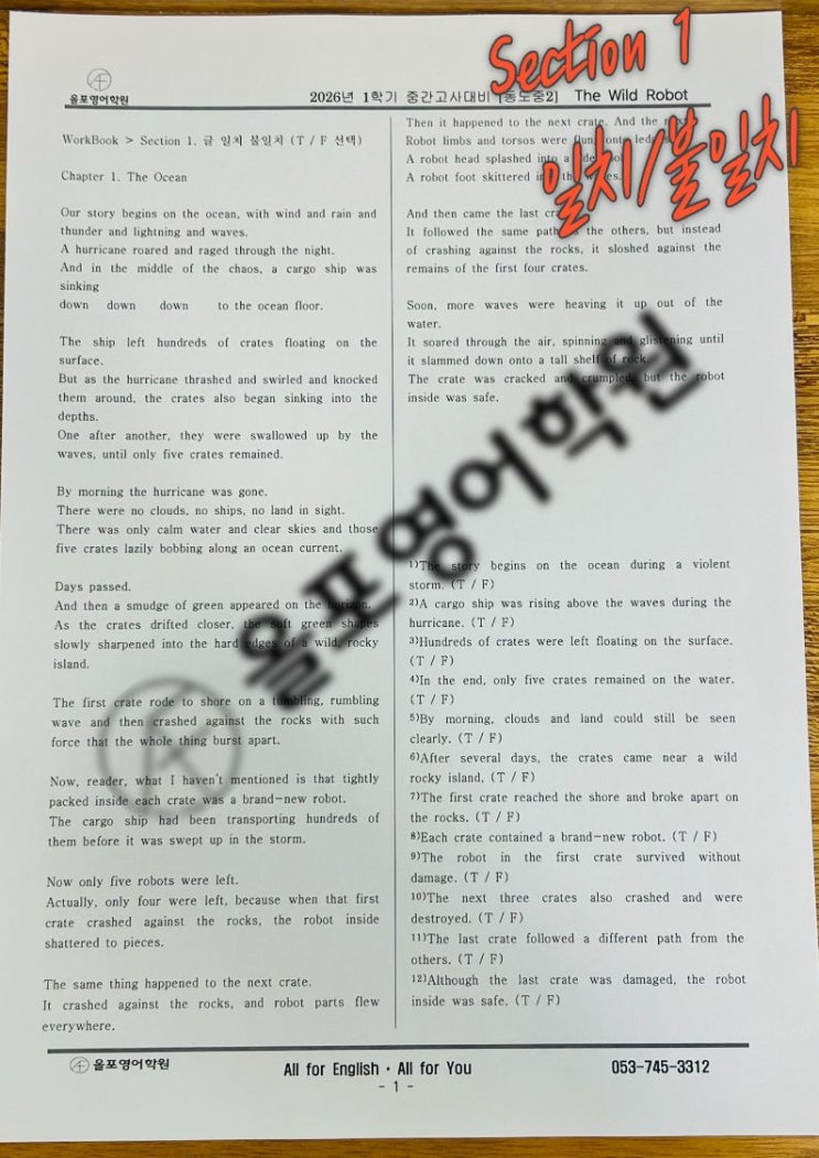 안녕하세요 올포영어학원입니다. 지난번 동도중2 원서수업 글에 이어, 오늘은 2탄으로 이어서 안내드립니다 오늘 소개할 자료는 동도중2 원서 The Wild Robot 수업의 워크시트입니다. 올포영어학생들은 이해력을 한 단계 더 끌어올리기 위해, 원장님표 변형문제 워크시트로 공부하고 있습니다. 단순히 읽고 해석하는 수준을 넘어서, 지문을 다양한 각도에서 바라보고 스스로 생각할 수 있도록 구성되어 있습니다. 원장님 왈 " 이대로 학교 시험에 나올지는 몰라도 , 이정도 시키면, 어떤 유형도 커버할수 있다!! 까지는 안되겠나 껄껄" 단순해석 - 해석을 넘어선 비유적 의미 이해 - 사고 확장까지 자연스럽게 이어지도록 설계되....... <img src="https://blogthumb.pstatic.net/MjAyNjA0MjFfMTU2/MDAxNzc2NzczOTMwMzQw.gCRX0TuhWY6XH82xpndetuRXPBv8zLSEsUMiNkGH1aEg.ab9PhJSNUMFJHovuiGEZC6t_QzJhIr1pAHQ336A59pkg.JPEG/001.jpg?type=s3" />