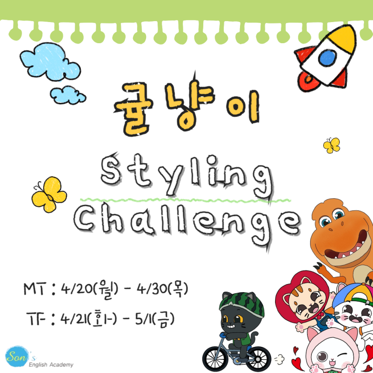 안녕하세요~ 손샘영어초등원입니다. 런업 친구들을 위해 어린이날을 맞이하여 이벤트를 준비해봤습니다!! 바로 바로 귤냥이 Styling Challenge When 기간 : 4/20(월) ~ 5/1(금) How (이번에는 반 별로~!) Mission Complete -> Get Item 미션 성공시 아이템 획득 가능 ! (미션 1개당 아이템 1개) Mission - NO 교재 미지참 - NO 숙제 재시 - NO 시험 재시 (면제O) - 만만만 1명 이상 - ALL 출석 (온라인X, 지각O) Prize 시상 : 5/7(목) ~ 5/8(금) 1등 : 1000P + special gift 2등 : 500P 3등 : 100P 인기상 : special gift 많은 관심 부탁드립니다~~!!! <img src="https://blogthumb.pstatic.net/MjAyNjA0MTVfMjQ3/MDAxNzc2MjUzNDg0NTcy.0BtmIR4bWeJKu0xmNateN8CAWJt0utkXA5GyDyD_kzgg.aLnuFQu349zyova6xUPsKm8mksKyH7VVqFwuMuA2FMog.PNG/001.png?type=s3" />