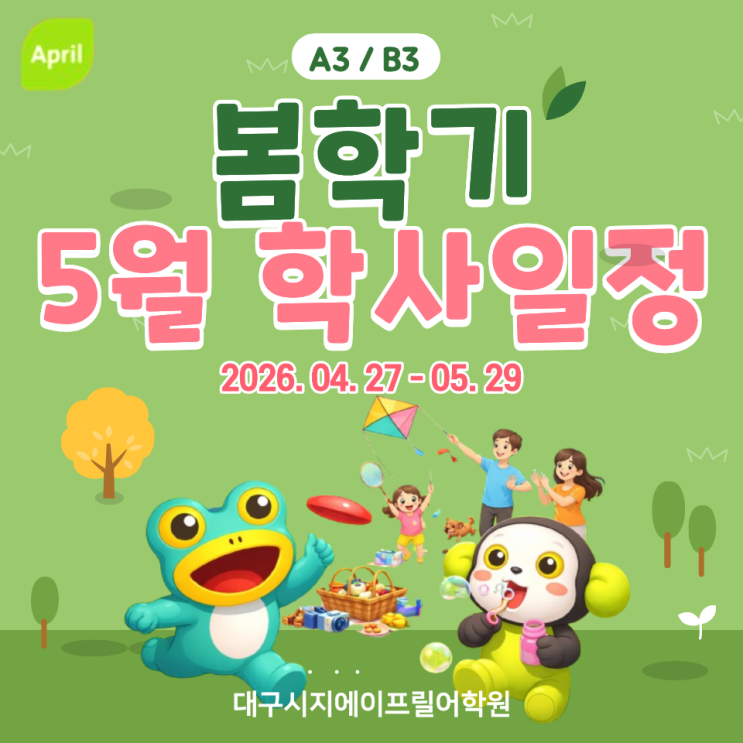 안녕하세요! 보다 효과적인 영어 학습의 시작, 시지에이프릴어학원입니다. 봄학기의 마지막 달인 5월은 레벨별로 중요한 시험인 Term Test (중간평가), Achievement Test (정기평가)가 있는 달입니다. 학사일정을 잘 참고하셔서 학습지도 부탁드립니다. ^^ 5월 주요 학사 일정 1. 봄학기 5월 (A3/B3) 개강 월수목반: 4월 27일(월) 화수금반: 4월 28일(화) ※ 개강일에 새교재 지참 필수! * April Starter → Book3 교재 * Seed1 A / Seed2 A / Sprout 1,2,3 → A3 교재 * Seedbed B / Seed1 B → B3 교재 2. 5월 주요 시험 일정 안내 * 레벨별 시험 일정 및 유형 상이 Term Test / Achievement Test (학원에서 진행되는 오프라인 시험) ★레....... <img src="https://blogthumb.pstatic.net/MjAyNjA0MTdfNzcg/MDAxNzc2NDE3MTYwMTk1.ypeyaP-_yeVjMRVCR1UOXzgCJgN4egrZrv4C-YcDqasg.lXdMgP5fPf8uz-THHU59BJlJ9A-i64cvoBacrAkIiDog.PNG/5%BF%F9_%C7%D0%BB%E7%C0%CF%C1%A4.png?type=s3" />