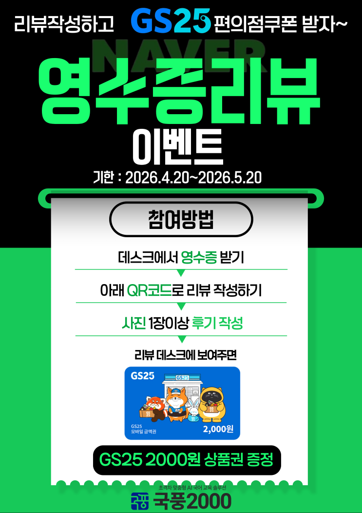 안녕하세요! 국풍2000광진관입니다. 따스한 봄기운이 완연한 4월입니다. 우리 학생들은 지금 한창 중간고사 대비로 열기를 올리고 있을 시기인데요. 학원에서 구슬땀을 흘리며 공부하는 아이들을 지켜보시는 학부모님들의 마음도 무척 설레고 또 한편으로는 긴장되시리라 생각합니다. 그동안 우리 아이가 학원을 다니며 보여준 소소한 변화들, 혹은 상담을 통해 느끼셨던 솔직한 생각들을 함께 나누고 싶어 특별한 리뷰 이벤트를 준비했습니다! 거창한 글이 아니어도 괜찮습니다. 가볍게 참여해 보세요. ⏰ 딱 1분! 3단계 초간단 참여 방법 바쁘신 학생들과 학부모님들을 위해 참여 방법은 딱1분 정도로 준비했습니다. 영수증 받기: 학원 데....... <img src="https://blogthumb.pstatic.net/MjAyNjA0MTlfMjcx/MDAxNzc2NTgyMTAyOTA3.qOQMcWWp2i7NhrxLzIUZuGoXAA0n3zoDr9iQN3PN-2Eg.DPu8pXRlEggXjy_YrRIvHnOMiMJ1jNdztiM2VBzxrAYg.PNG/%B1%A4%C0%E5%B5%BF%B1%B9%BE%EE%C7%D0%BF%F8.png?type=s3" />