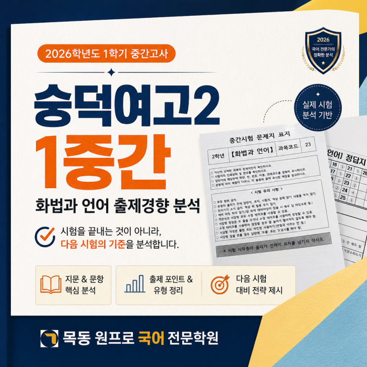 안녕하세요. 인천 NO.1 수능으로 설계하고, 내신으로 적중 수능국어 / 내신국어 절대 강자 구월동 목동원프로 국어전문학원입니다 2026학년도 숭덕여고 2학년 화법과 언어 시험 총평: 고난도 서답형 감점을 잡아라 어제 치러진 숭덕여고 2학년 1학기 중간고사 [화법과 언어] 시험지에 대한 정밀 분석 결과를 공유합니다. 이번 시험은 학생들에게 상당한 심리적 압박과 실질적인 난이도를 모두 안겨준 시험이었습니다. 어떤 점이 어려웠고, 앞으로 기말고사는 어떻게 준비해야 할지 핵심만 짚어보겠습니다. 왜 숭덕여고 국어가 어려운지, 그리고 #목동원프로는 어떻게 그 해법을 제시하는지 상세히 공개합니다. 1. 시험범위와 구성, 전체....... <img src="https://blogthumb.pstatic.net/MjAyNjA0MjlfMjc1/MDAxNzc3NDYwMTU3NTE4.5Xy0Ifyd_jkse1LVIrA1X7LXrbLAnBI-z0WWhJvlYi4g.Fw55maj3td6Fpcd1DncOR4jjC_wB-XMrcWt8xAtCP0Ug.PNG/ChatGPT_Image_2026%B3%E2_4%BF%F9_29%C0%CF_%BF%C0%C8%C4_07_36_47.png?type=s3" />
