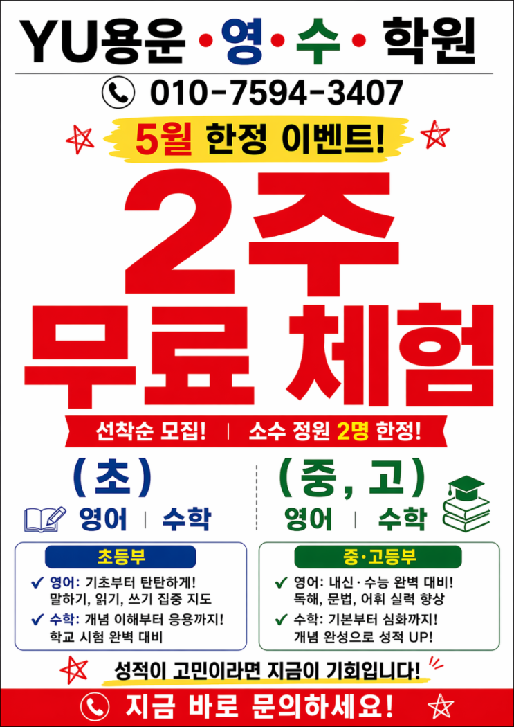 영어•수학 ×2주 무료 체험 학생모집 ( 선착순 2명)