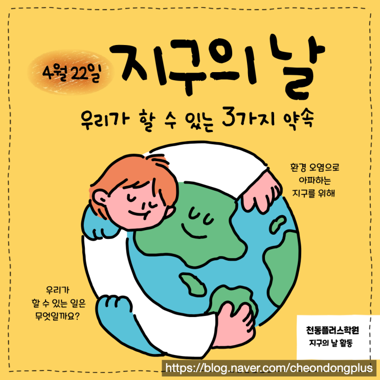 4 4월 22일 은 지구의 날 미국에서 기름유출 사건으로 생긴 지구의 날입니다. 2007년 태안 기름 유출 사건이 생각이 나네요. 복구하기 위하여 많은 사람들이 고생했어요. 1. 천동플러스학원에서는 종이컵을 사용하지 않아요. 2. 아이들이 사용했던 프린트물은 항상 이면지 활용을 합니다. 3. 가까운 거리는 걸어 다니려고 노력합니다. 아쉽게도 이 활동은 못했어요. 내년에는 꼭 해볼게요. <img src="https://blogthumb.pstatic.net/MjAyNjA0MjNfMzgg/MDAxNzc2OTEwMDA1MTA5.pMq2gW_ltrEHevJhKWuevnolEtN94A0QxgdtNxrdoRgg.megUdMVSdu-n7HXCVOOaQ37MR1T9Qxh_TpXX-XFiDvEg.PNG/1.png?type=s3" />