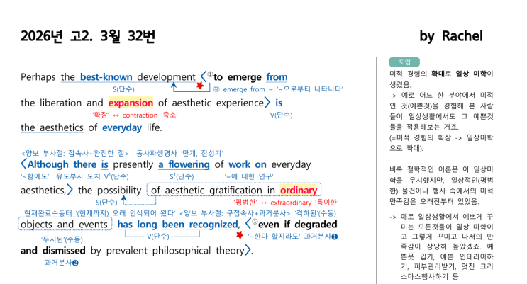 안녕하세요. Rachel입니다. 이번26년도 고2 3월 모의고사 영어의 1등급 비율이 3.48%로 작년 불수능 영어 수준과 거의 비슷할 정도로 어려웠네요. 특히 32번은 내용이 너무 추상적이고 해석자체가 어려워서 오답률 1위를 차지하며 아이들을 혼란의 도가니로 몰아넣었죠ㅜㅡ 저희 학원의 잘하는 학생들조차 무슨말인지 모르겠다며 난색을 표해서 제가 예시를 들어가며 정리를 좀 해보았습니다. 참고해보세요. 2026년 고2 3월 32번 모의고사 설명 주제: 일상생활의 미학 도입] 미적 경험의 확대로 일상 미학이 생겼음. -> 예로 어느 한 분야에서 미적인 것(예쁜것)을 경험해 본 사람들이 일상생활에서도 그 예쁜것들을 적용해보는 거죠. (=....... <img src="https://blogthumb.pstatic.net/MjAyNjA0MTdfMTYw/MDAxNzc2NDExMDU3MTQ3.OAELbdA_-zhb8R5SRPYf-u0Yqi8YQ3GzFW8GfirwM_gg.93ur0ZR7tcqhKw5hPVuuNY42Oyh3Dl956iOoOZbVCQgg.PNG/11.png?type=s3" />