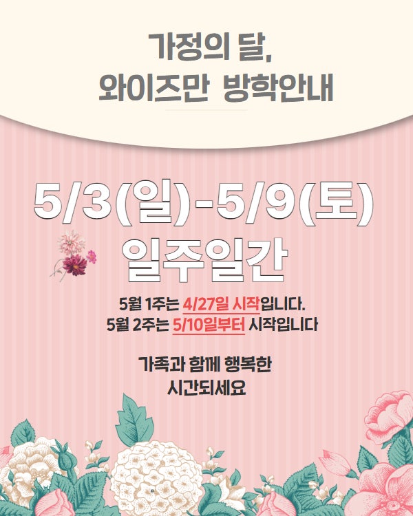 내 아이의 미래가 바뀌는 수학과학 학원 와이즈만! 미래를 만드는 이공계탑티어! 과정과 서술 그리고 그 서사가 완벽한 탐구와 논서술 중심 와이즈만 도안센터는 5월을 맞아, 일주일간 방학이 있습니다. 5월은 4/27일부터 5/30일까지 1주 휴원을 포함하여 총 5주간 진행됩니다. 가족과 함께 행복하고 건강한 방학 보내세요 <img src="https://blogthumb.pstatic.net/MjAyNjA0MjJfMjUx/MDAxNzc2ODU2ODExMzEz.ezQxlvJ8b4At-O9adPAnjBdT5YIaQynRpPKTvPoi3Vcg.vLBGJqW3-RdEUZOkyTLvCC904KbBMRRN9hnoDg2_hNsg.JPEG/%C1%A6%B8%F1%C0%BB_%C0%D4%B7%C2%C7%CF%BC%BC%BF%E4_%2821%29.jpg?type=s3" />