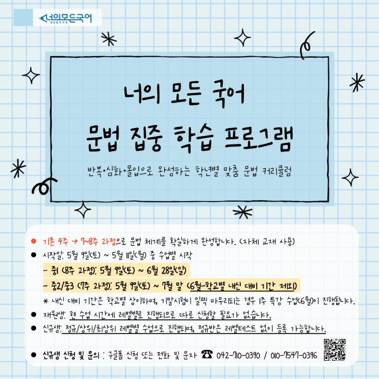 2026 문법 집중 학습 프로그램 안내 [문법은 반복·심화·몰입이 답입니다] 이해만으로 남지 않는 과목, 문법. '너의 모든 국어'는 다가오는 5월부터 학년별 문법 집중 학습 기간을 운영하며, 학생들이 문법 체계를 확실하게 잡고 내신과 고등 선행을 동시에 준비할 수 있도록 돕습니다. 1. 학년별 과정 및 특징 중1 과정: 문방구 (문법의 방향을 구하다) - 과정 목표: 중등 문법 (중1~~중3) 전체 과정을 한발 먼저 공부하여 문법의 기초 체계를 완성합니다. - 학습 효과: 중등 문법 선행의 이점 최대화 중등 문법을 미리 학습함으로써 학생들은 학교 수업에서 자신감을 가지고 참여할 수 있으며, 문법에 대한 두려움을 극복하고 적극적....... <img src="https://blogthumb.pstatic.net/MjAyNjA0MjZfMjU5/MDAxNzc3MTk1MjU3OTM4.442KWneAhYpRjFS72eTnZzQvuG3F4VuyzIGlQ3cv7fcg.jqFQn_rMgpW3j3oCKbfkcA9wxZNykqLCwN87TjmI0BIg.JPEG/1.jpg?type=s3" />