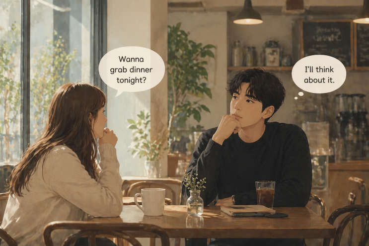 “I’ll think about it.” 한번 생각해볼게 ✔ 이런 상황에서 써요 ✔ 누가 제안을 했을 때 바로 답하기 애매할 때 ✔ 아직 결정하기에 정보가 부족할 때 ✔ 부담 없이 시간을 벌고 싶을 때 실제 사용 상황 “같이 저녁 먹을래?” → I’ll think about it. “이거 해볼래?” → I’ll think about it. “이번 주에 시간 돼?” → I’ll think about it. 문장 포인트 | 발음 | 아일 띵크 어바웃 잇 | | 뉘앙스 | 즉답을 피하면서 여지를 남기는 표현”이라는 의미 | | 포인트 | “think about it” = 결정 전에 고려하다 | | 비슷한 표현 | ✔ “Let me think about it.” → 좀 더 공손하고 자연스러운 느낌 ✔ “I need s....... <img src="https://blogthumb.pstatic.net/MjAyNjA0MzBfMTI3/MDAxNzc3NTA4NDk2ODYy.Bcc6H-aLWKvkR0rEgZNVzxHBibnTtcKVCac_JY6ImvYg._TbHXDHZXndGlgIltgiqrO7j3tl8hd-AqlxNVSWrWtsg.PNG/ChatGPT_Image_2026%B3%E2_4%BF%F9_30%C0%CF_%BF%C0%C0%FC_09_18_13.png?type=s3" />