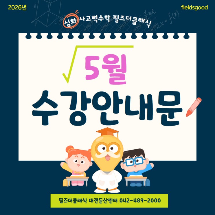 안녕하세요?~ 심화사고력수학전문학원 필즈더클래식 대전둔산센터입니다. 어느덧 따스한 햇살과 함께 가정의 달 5월이 다가오고 있습니다. 5월은 어린이날이 있어 아이들에게 더욱 특별하고 의미 있는 달입니다. 사랑과 관심 속에서 아이들이 마음껏 웃고, 행복한 추억을 많이 쌓을 수 있기를 바래봅니다. ✅ 5월 행사일정 ✅ 5월 학부모설명회 ▶ 5월 학부모설명회 예약링크:https://forms.gle/tQxEaSzdL4uR8zg17 ✅ 5월 입학테스트 ▶ 5월 입학테스트 예약링크: https://fieldsgood.co.kr/fet/index.php?fc_ccode=F0 ✅ 필즈더클래식 둔산센터 공식 블로그 https://blog.naver.com/cjs6526 수업 관련 문의사항은 언제나 편하게 오픈채....... <img src="https://blogthumb.pstatic.net/MjAyNjA0MjVfMTQ2/MDAxNzc3MDc3OTAxODg2.XE2a5fDbQDBEm65k8_rF5RsbkwwLqwYBztHXGozp6Xgg.3waVpPUzgMmYn8SsILw4W1v1bOkcxSlesxRPeHE_Irog.JPEG/5%BF%F9_%BC%F6%B0%AD%BE%C8%B3%BB%B9%AE_1.jpg?type=s3" />