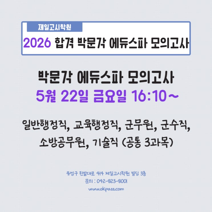 안녕하세요 : ) 제일고시학원 본점(충대앞) 입니다 ! 26년 지방직, 군무원 대비를 위한 박문각 모의고사! 5월 모의고사가 학원 현장에서 5월 22일에 시행되며 3층 상담실 방문, 전화 접수가 가능합니다! 모의가사가 왜 중요할까요? 학습성취도 진단을 위한 종합적 평가와 합격예측을 위한 실전모의고사로 실전시험에 완벽 대비합니다. 박문각 에듀스파 모의고사 5월 22일 금요일 16:10~ 어떤 시험이든 문제풀이를 통한 연습은 선택이 아닌 필수라고 해도 과언이 아닙니다. 그중에서 모의고사는 꼭 필요한 과정으로 시험에 대한 적응력 훈련과 영역별 시험시간의 분배는 물론, 시험결과를 토대로한 자신의 강점과 약점파악을 손쉽게 알 수 있기 때....... <img src="https://blogthumb.pstatic.net/MjAyNjA0MzBfMTk5/MDAxNzc3NTEzMzkwODI4.x5nOPIVQmEUN_dNxYpco9mQW20Hz0aea_VqQc929NoIg.g1EkDaFSXO6luj5TJ0vf2MjgwuwBoRE8MdHLFGugXYkg.JPEG/%C1%A6%B8%F1%C0%BB_%C0%D4%B7%C2%C7%D8%C1%D6%BC%BC%BF%E4_-001_%2854%29.jpg?type=s3" />