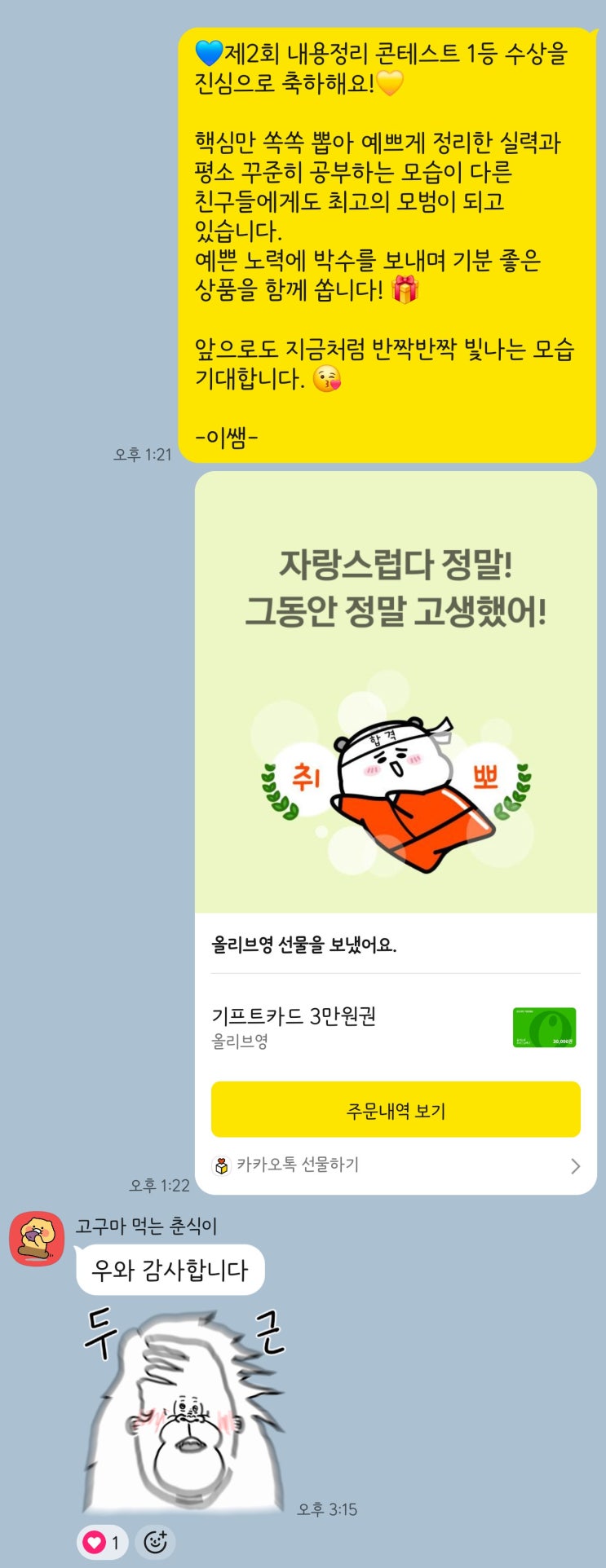 안녕하세요 이쌤영어학원입니다^^ 지난 주 이쌤영어학원의 1등급 비결이자 자랑 '내용정리' Contest 투표가 있었습니다. 이쌤영어학원 학생들이 직접 8개의 후보중 가장 잘 정리한 학생에게 투표를 하였습니다. <1등: 유성여고 2학년 김O영> <2등: 지족고 1학년 유O희> <공동 3등: 유성여고 1학년 나O희> <공동 3등: 지족고 3학년 이O윤> 수상한 학생들 너무너무 축하합니다!!! 그 외 수상하지 못했지만 꾸준히 내용정리 해오는 우리 이쌤영어학원 학생들 다들 너무 대견스럽습니다! 제 3회 내용정리 CONTEST에서 좋은 결과가 있길 기대하며 계속 열심히 내용정리 하길 바래요! 노은고, 지족고, 유성여고, 대....... <img src="https://blogthumb.pstatic.net/MjAyNjA0MjZfMjI2/MDAxNzc3MjAzNzQyNzIz.inH7mfMPEOgrbyoEGnn2jqe0ev1hK5bHxlQsOjAOYPEg.0oZa9odBWX79JhJF_ephbEcfvIyK39trS1Tb5Y-twlQg.JPEG/KakaoTalk_20260426_203943906.jpg?type=s3" />